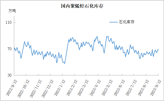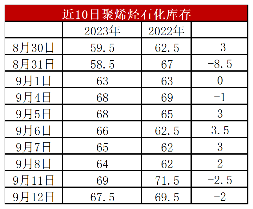 分析:周二石化库存67.5万吨,较昨天下降1.5万吨,较去年同期低2万吨。8月份以来石化去库明显放缓,甚至出现高于去年同期的情况。目前来看供应端压力不减,需求改善有限,且社会库存整体偏高,石化去库难度加大,预计近期维持缓慢去库状态。