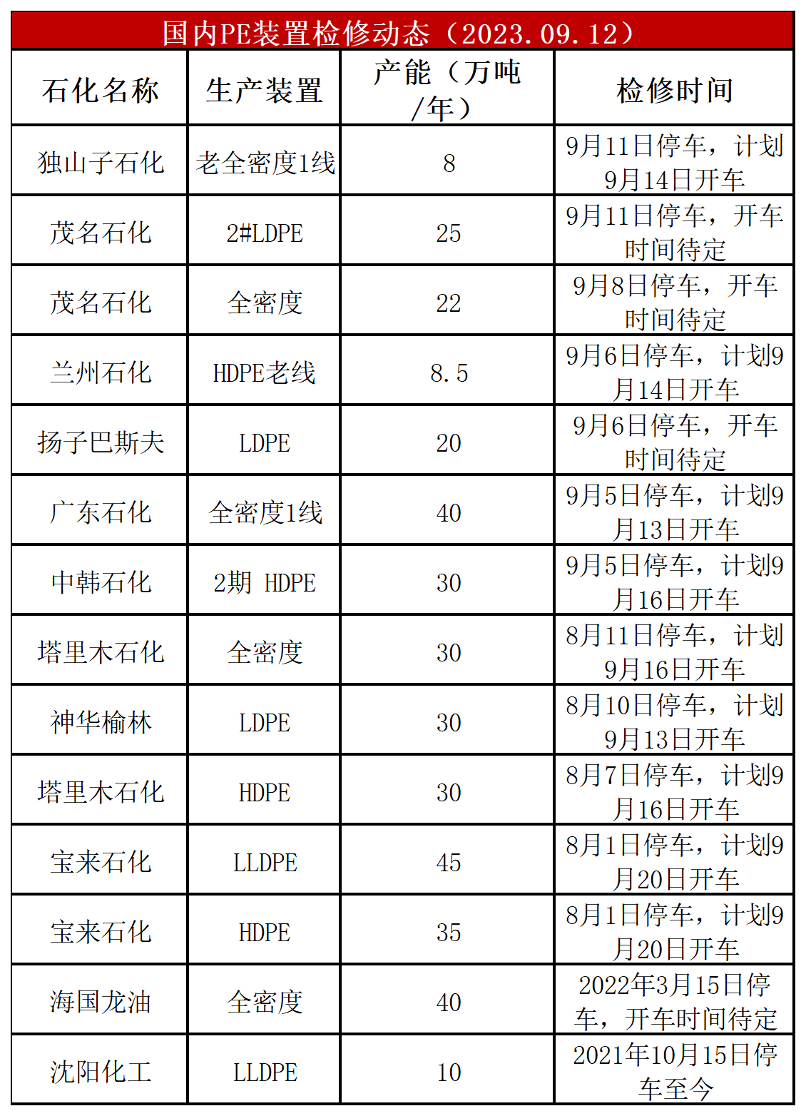 简评:PE装置大庆石化HDPE、神华榆林LDPE、燕山石化HDPE、齐鲁石化老全密度、茂名石化全密度开车,独山子石化老全密度、茂名石化LDPE停车,开工负荷上涨至90%左右,比上周-2%,较去年同期-2%。PE兰州石化HDPE、独山子时候全密度、塔里木时候HDPE和全密度计划开车,四川石化计划停车大修,预计PE开工负荷上涨为主。