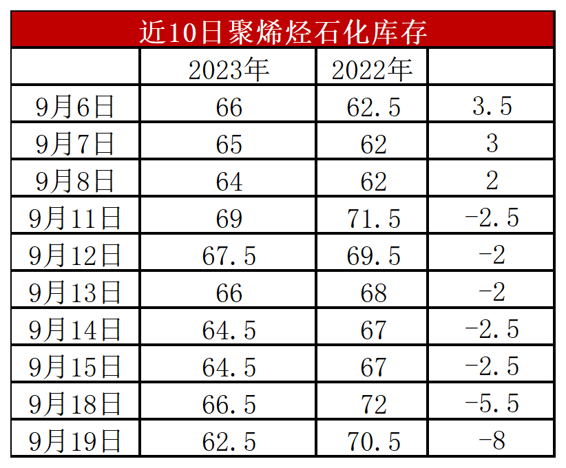 分析:周二石化库存62.5万吨,较昨天下降4万吨,较去年同期低8.5万吨。近期石化去库有所提速,一方面近期计划外检修装置增多,尤其是PP普遍亏损背景下被动降负,另一方面金九银十刚需启动,下游订单好转,接货增多。