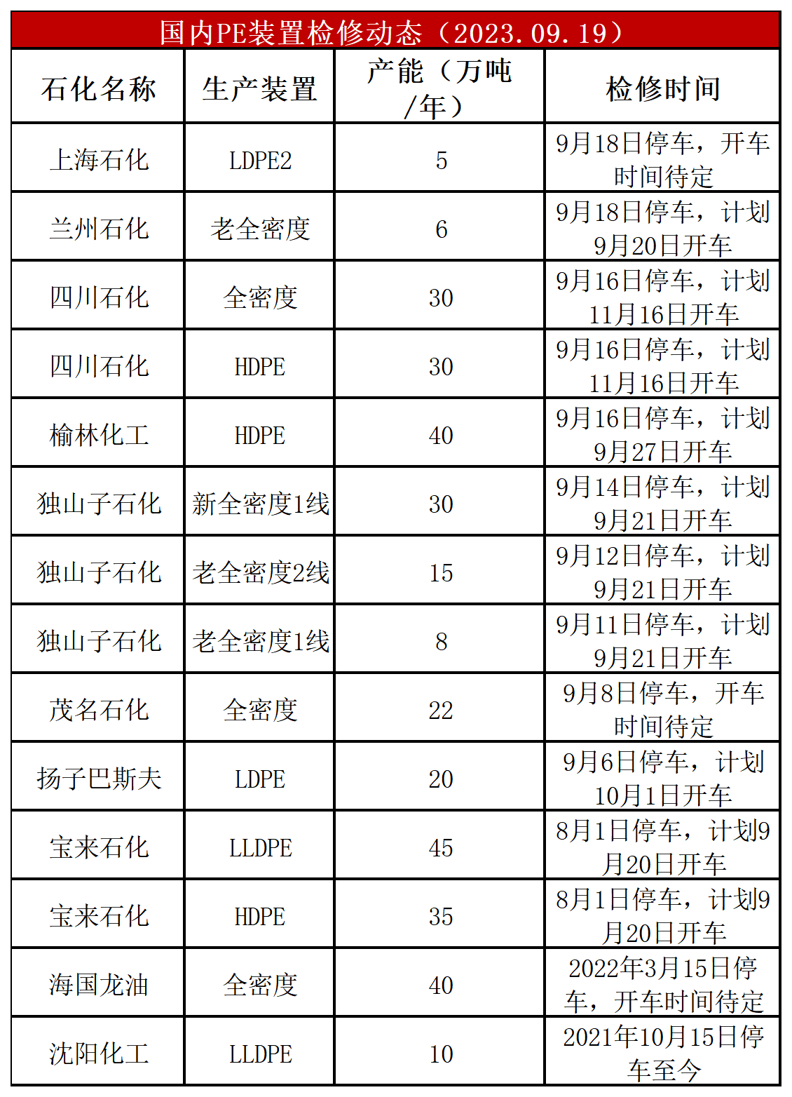 简评:PE装置塔里木全密度和HDPE、中韩石化HDPE开车,兰州石化老全密度、独山子HDPE、上海石化LDPE停车,四川石化全厂大修,开工负荷维持89%左右,比上周-1%,较去年同期+1%。PE宝来全厂大修即将结束,独山子石化全密度计划开车,独山子石化HDPE计划停车,预计PE开工负荷小幅上涨。