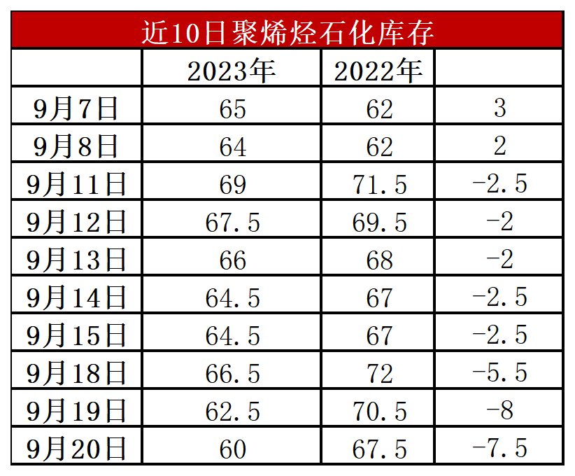 分析:周三石化库存60万吨,较昨天下降2.5万吨,较去年同期低7.5万吨。近期石化去库有所提速,一方面近期计划外检修装置增多,尤其是PP普遍亏损背景下被动降负,另一方面金九银十刚需启动,下游订单好转,接货增多,尤其是随着国庆节临近,备货意向明显。
