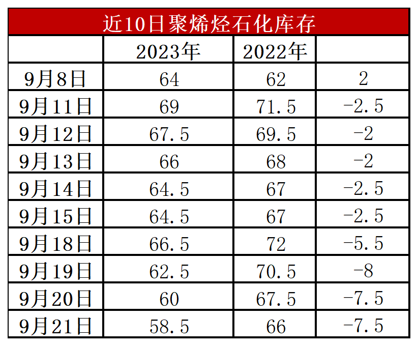 分析:周四石化库存58.5万吨,较昨天下降1.5万吨,较去年同期低7.5万吨。近期石化去库有所提速,一方面近期计划外检修装置增多,尤其是PP普遍亏损背景下被动降负,另一方面金九银十刚需启动,下游订单好转,接货增多,尤其是随着国庆节临近,备货意向明显。