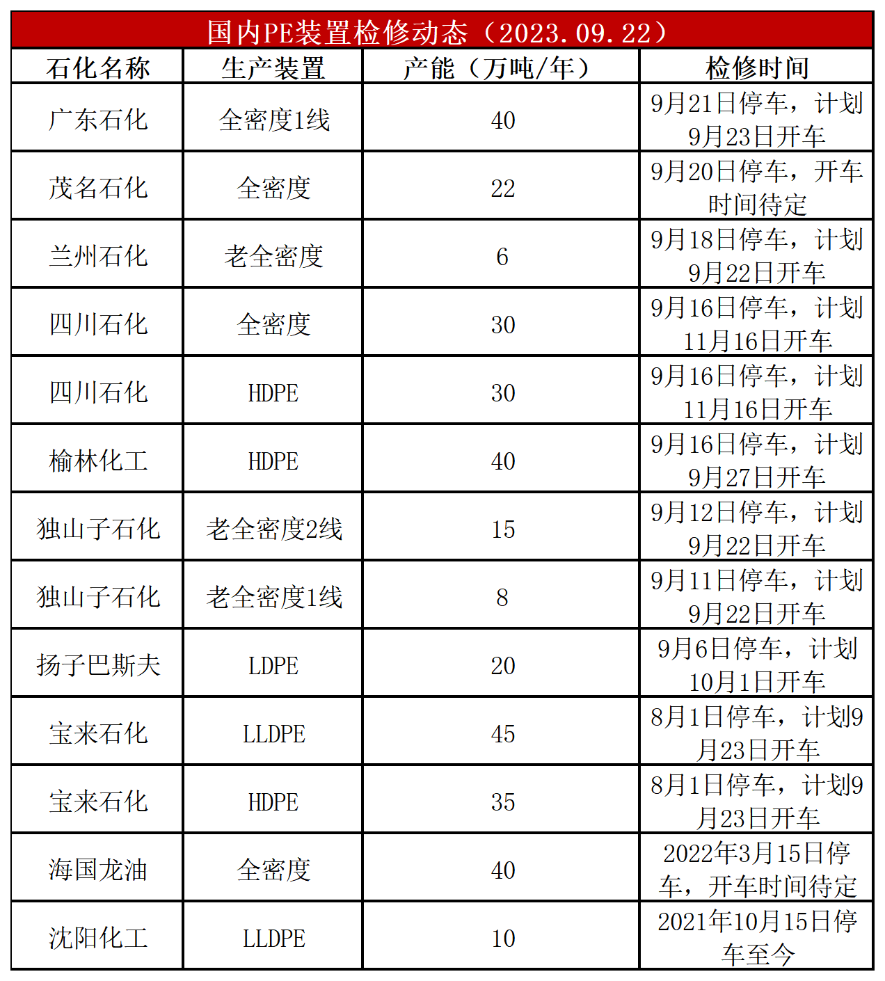 简评:PE装置广东石化全密度停车,开工负荷维持89%左右,比上周+1%,较去年同期+0%。PE宝来全厂大修即将结束,兰州石化全密度计划开车,齐鲁石化HDPE计划停车,预计PE开工负荷小幅上涨。