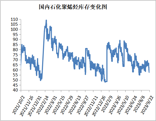 截至9月22日石化聚烯烃库存在57.5万吨,较上周下跌7万吨。石化库存跌幅扩大,主因盘面大幅拉涨,下游十一备货超预期进行,临时检修装置和开车推迟装置较多,供应也无压力,石化库存跌幅较大。下周,备货行情预计陆续结束,供应预计小幅增加,石化有积极去库预期,库存或维持跌势。