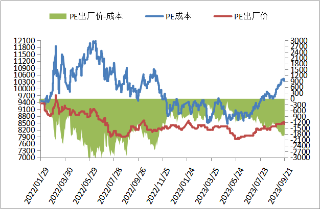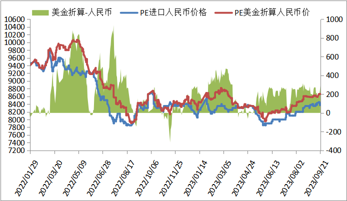 本周PE进口线性美金主流价格部分上涨,周末在980-990,折算人民币成本在8650-8750,市场主流8300-8350,高国产线性350-400左右,价差略扩大。