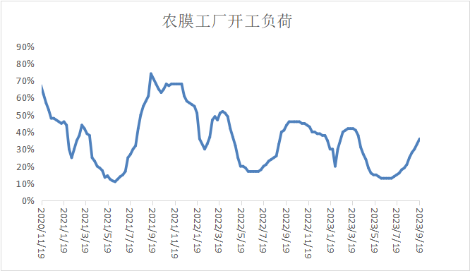 本周农膜开工负荷维持小幅上升3%,在36%左右,开工负荷提升不及预期。大部分按需采购,需求逐渐跟进,整体原料库存略有减少,但是订单天数继续维增加。下周预计农膜加速进入旺季,需求继续增加,十一备货预计陆续结束,预计下周农膜开工负荷继续上涨,刚需对聚乙烯推涨支撑较强。