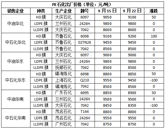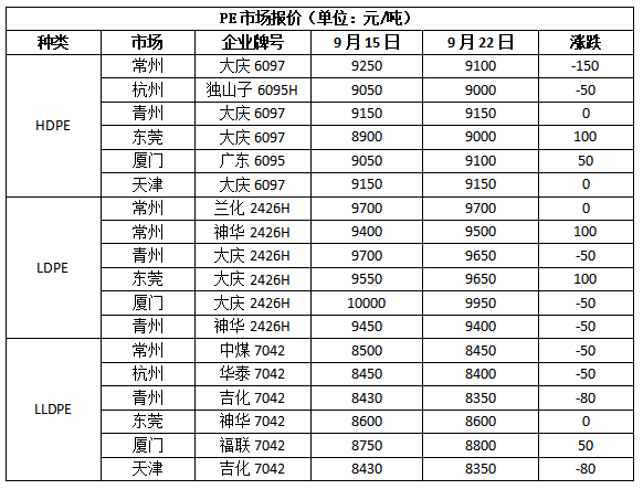 华北市场LLDPE主流8280-8350,LDPE主流9400-9550,HDPE主流8200-9100;华东市场LLDPE主流8370-8450,LDPE主流9350-9600,HDPE主流8150-9300;华南市场LLDPE主流8600-8900,LDPE主流9450-9650,HDPE主流8600-9650。