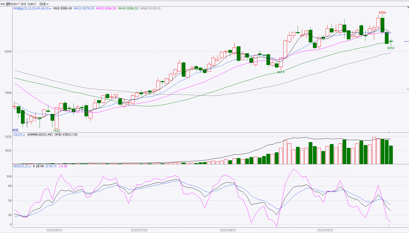 本周塑料主力先涨后跌, MACD维持绿柱并延长, KDJ指标形成死叉继续向下发散,宽幅整理后逐渐转为小幅整理寻找方向。20日均线转弱,周线向下整理,市场维持回调趋势,下游逢低备货,低价成交尚可,情绪并不太空,但是推涨困难,市场陆续休市,预计塑料主力弱势调整,仅供参考。