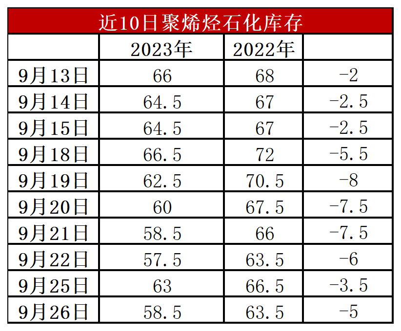 分析:周二石化库存58.5万吨,较昨天下降4.5万吨,较去年同期低5万吨。9月中旬石化去库提速,主要得益于国庆节临近,下游备货积极性较高,石化去库提速,一度跌破60万吨大关,不过国庆即将来临,下游备货进入尾声,加之社会库存整体偏高,预计后期去库难度增加,尤其是国庆节后面临较大的垒库压力。