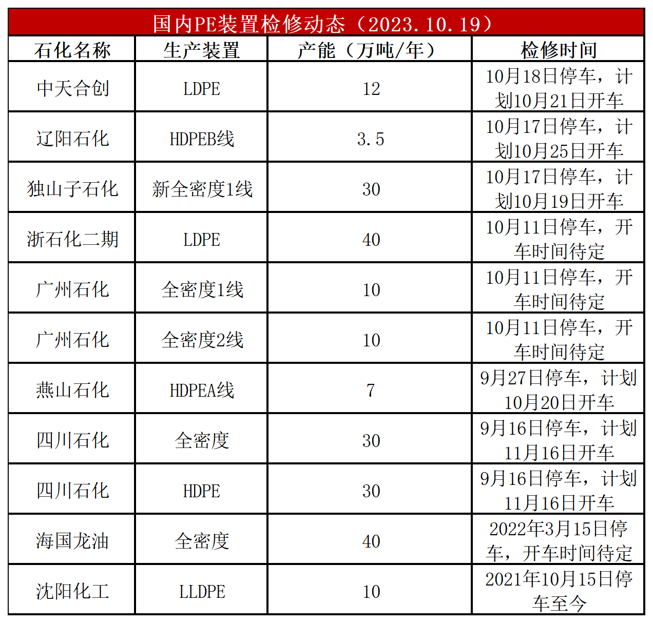 简评:PE装置上海石化LDPE开车,辽阳石化HDPE、中天合创LDPE停车,开工负荷下降至91%左右,比上周+1%,较去年同期-2%。PE装置燕山石化HDPE、独山子全密度、辽阳石化HDPE、中天合创计划开车,壳牌计划停车大修,预计PE开工负荷小幅调整。