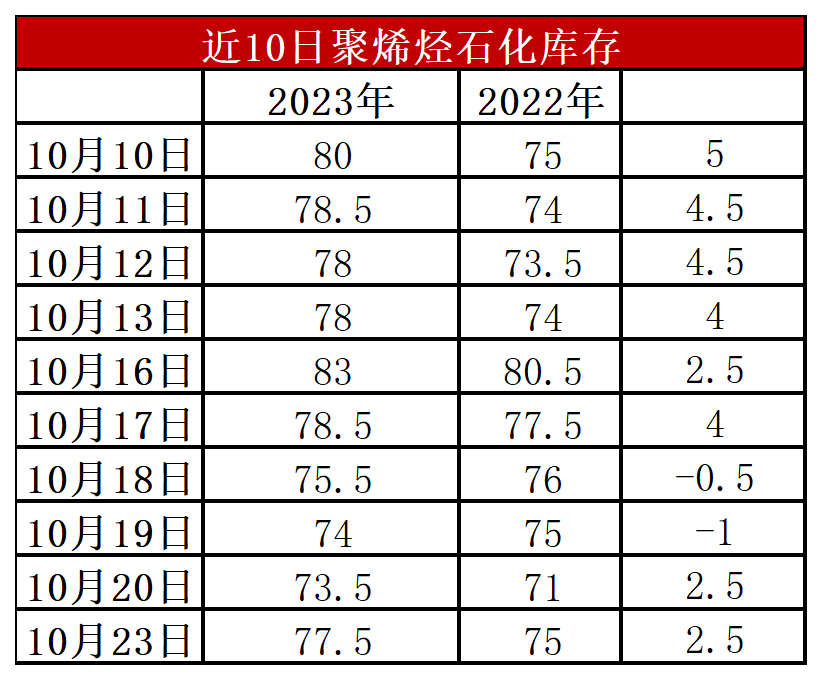 分析:周一石化库存77.5万吨,较上周末增加4万吨,较去年同期高2.5万吨。国庆节后石化逐渐恢复正常去库,但是目前库存水平整体偏高,低库存优势不在。虽然处于金九银十旺季,但是终端需求反馈一般,供应端压力预期较大但是暂时体现不明显,预计近期继续维持正常去库状态。
