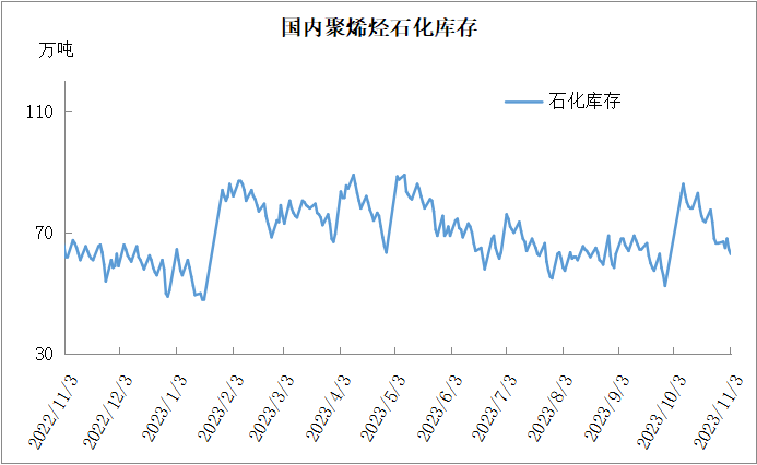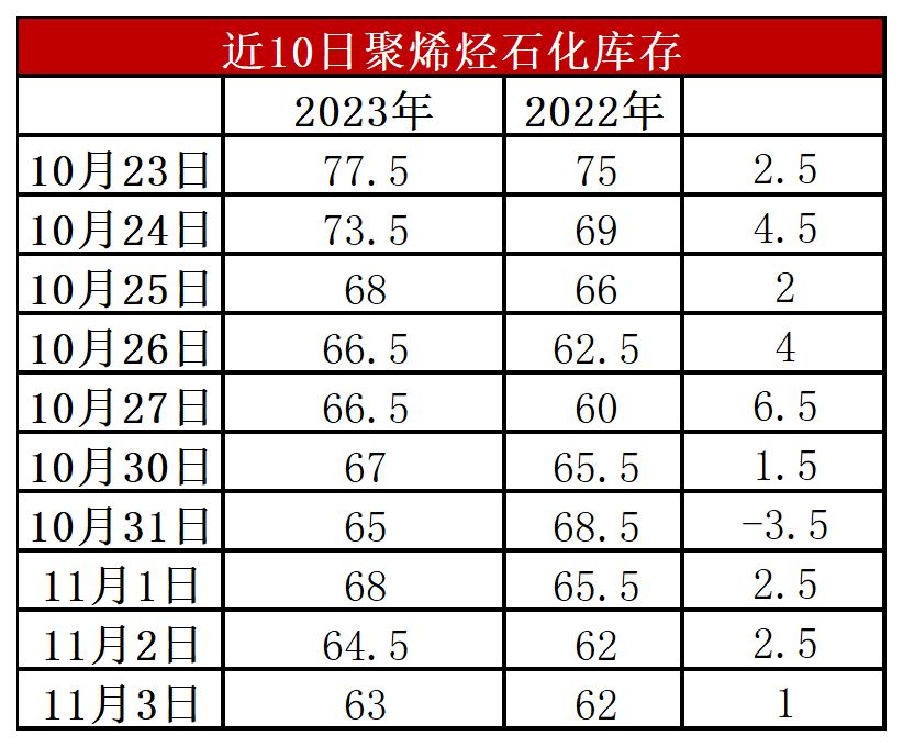 分析:周五石化库存63万吨,较昨天下降1.5万吨,基本与去年同期持平。10月份整体去库效果显著,主要得益于金九银十需求旺季刚需以及检修增多。月底两桶油停销结算,库存短暂垒库后再次恢复正常去库;虽然检修增多下供应压力缓解,但是旺季结束需求或逐渐减弱,供需双弱背景下石化继续维持正常去库。