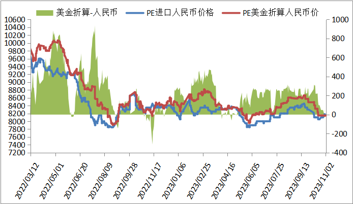 本周PE进口线性美金主流价格大稳小动,周末在920-960,折算人民币成本在8150-8500,市场主流8100-8150,高国产线性50-350,价差略缩小。