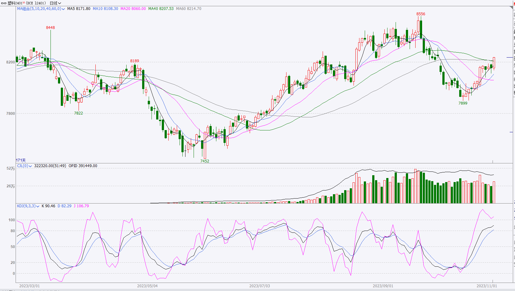 本周塑料主力横盘整理后上涨, 处于回调周期。MACD指标红柱持续延长,KDJ指标走势偏强,多平多开较多。现阶段仍处于反弹周期,突破压力点位8200后推涨动力不足,周K线也到了关键压力位,多单开始减仓,基本面难以支撑盘面持续上涨,有回调预期,预计L01先涨后跌,仅供参考。