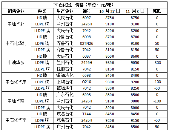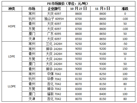 华北市场LLDPE主流8100-8150,LDPE主流9080-9150,HDPE主流8000-8650;华东市场LLDPE主流8150-8250,LDPE主流9150-9250,HDPE主流8050-8500;华南市场LLDPE主流8300-8750,LDPE主流9100-9350,HDPE主流8400-8850。