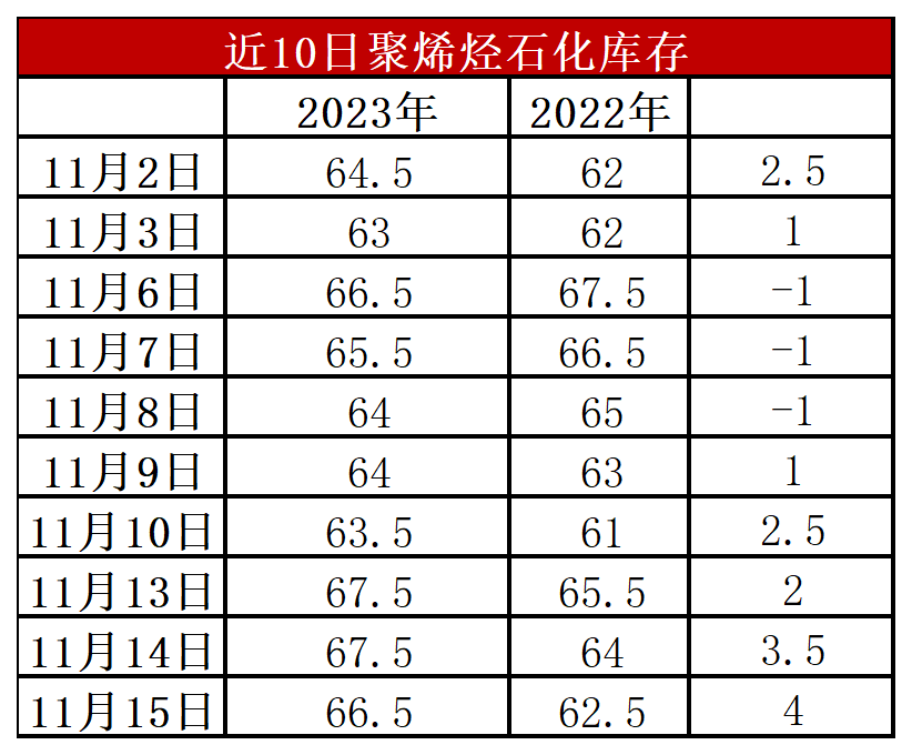 分析:周二石化库存64.5万吨,与昨日下跌1万吨,较去年同期高4万吨。近期石化去库速度由快变慢,前期快速去库得益于金九银十旺季刚需以及检修装置增多,但是金九银十旺季结束需求转弱,近期聚烯烃开工率也有所反弹,去库速度明显放缓,但是库存压力尚未体现。