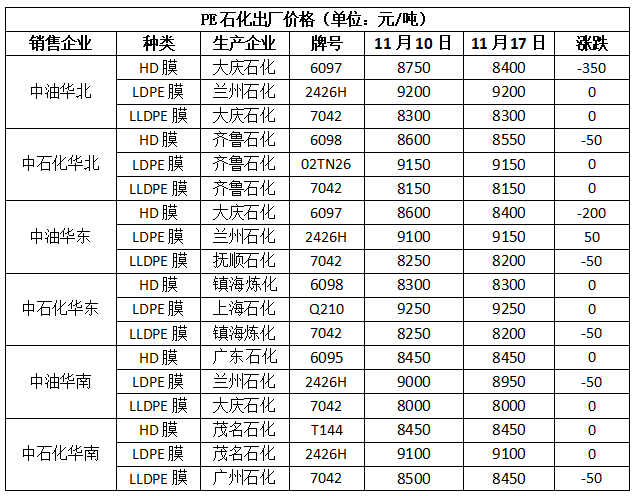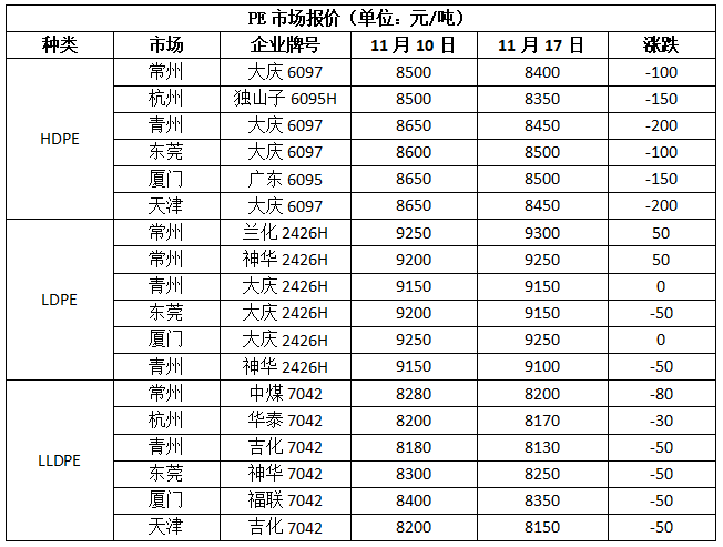 华北市场LLDPE主流8080-8150,LDPE主流9100-9150,HDPE主流8030-8650;华东市场LLDPE主流8140-8250,LDPE主流9200-9300,HDPE主流8050-8600;华南市场LLDPE主流8300-8750,LDPE主流9050-9150,HDPE主流8400-8750。