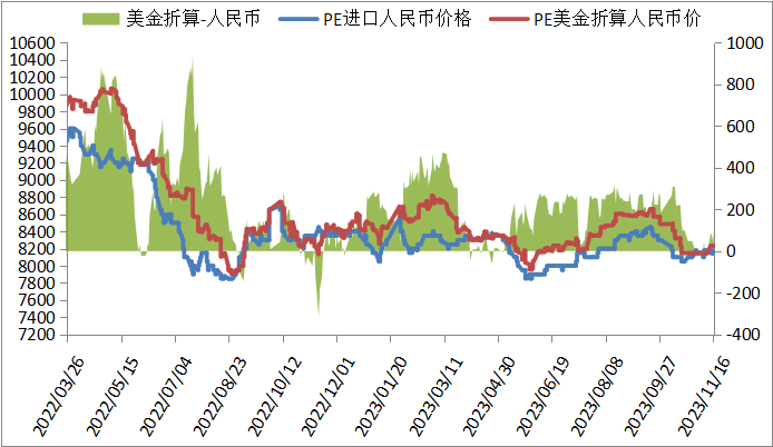 本周PE进口线性美金主流价格大稳小动,周末在920-960,折算人民币成本在8150-8500,市场主流8100-8200,高国产线性50-300,价差略缩小。