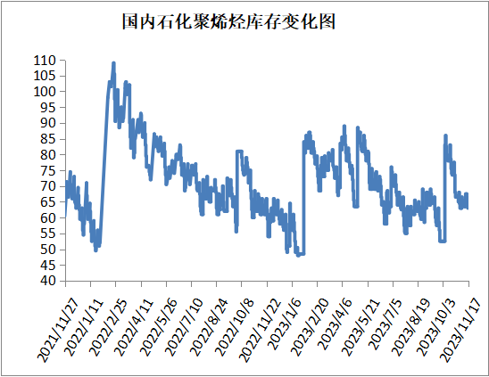 截至11月17日石化聚烯烃库存在63.0万吨,较上周-0.5万吨,石化去库减慢。国内供应陆续回归,进口HDPE和LDPE资源也到港较多,而恶劣天气减少,运输陆续转为正常;下游开工负荷维持小幅减弱,库存消化减弱,来自宏观面的拉涨难以提振下游拿货情绪,所以石化库存变化不大。下周国内外供应预计维持,下游需求有进一步减弱预期,恶劣天气即将影响东北,运输预计受影响,石化压力不大,预计继续挺价,所以预计石化库存预计变化不大。