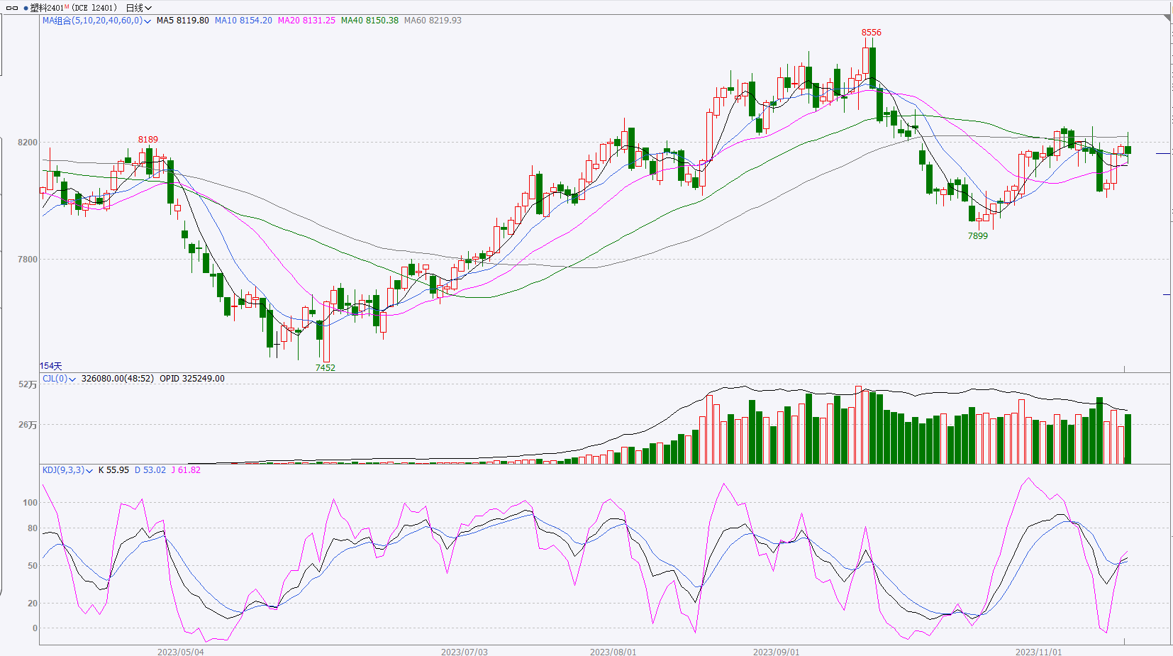 本周塑料主力先跌后涨, MACD指标红柱转绿柱后再转红柱,KDJ指标形成金叉后涨势放缓,多平较多。塑料主力重回观望心态, MACD和KDJ指标提示塑料上方压力较大,上方压力位暂看8250,而周K线下影线较长,下周或有小幅回调预期,塑料主力也已经向05陆续移仓,所以预计L01高位宽幅调整,仅供参考。