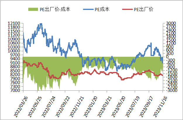 本周聚乙烯市场弱势调整,幅度在30-200元/吨,HDPE跌幅较大。周初聚乙烯陆续回归偏弱基本面,市场价格呈跌势;而周中开始旧金山会谈连续释放利好消息,国内超预期经济数据发布,煤炭和乙烷事件消息面也给与支持,聚乙烯止跌小幅反弹;而石化出厂价相对坚挺,社会库存和石化库存去库缓慢,市场心态维持偏空,成交放量减少,基差呈走弱趋势。
