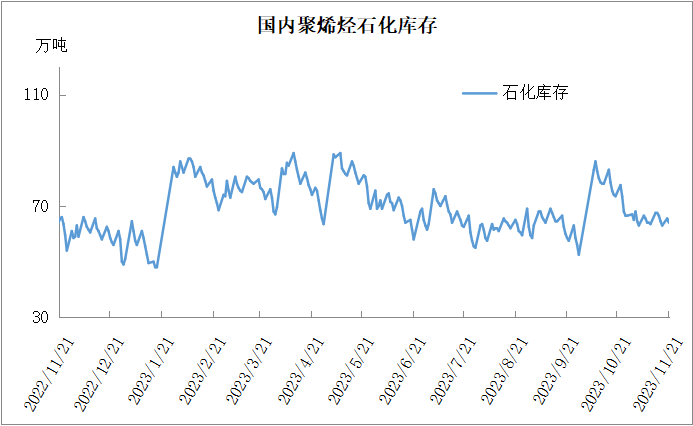 分析:周二石化库存64万吨,较昨天下降1.5万吨,较去年同期低2万吨。进入11月份以来,石化去库速度明显放缓,基本维持周内去库5万吨以内水平。前期石化企业检修较多,尤其是亏损背景下计划外检修增多,但是随着油价整体下落,利润明显改善,检修力度有所下降,需求也整体偏弱,预计近期石化维持缓慢去库。