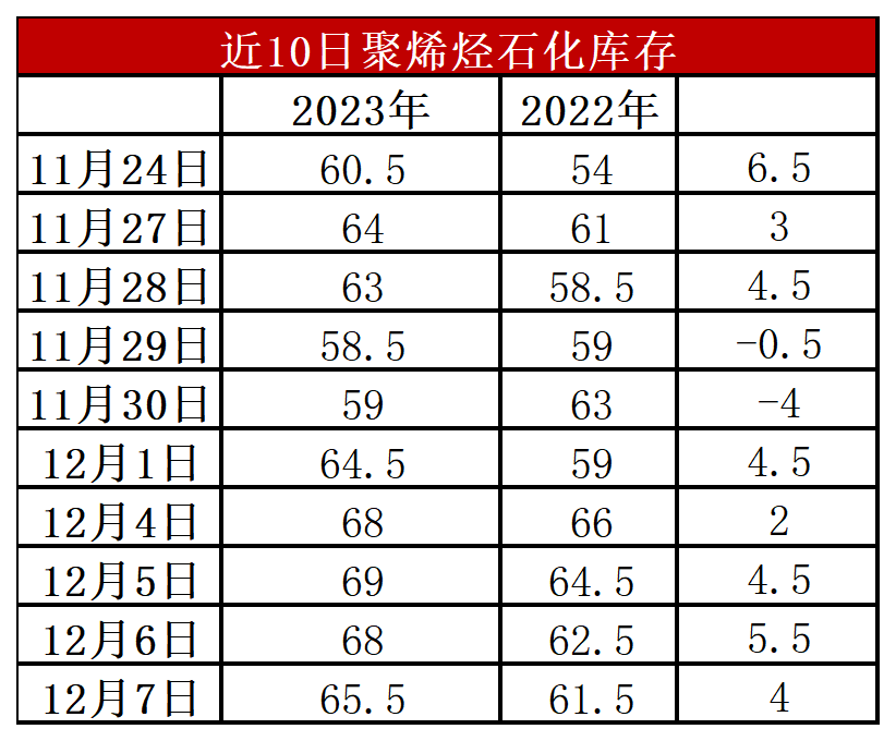 分析:周四石化库存65.5万吨,较昨天下降2.5万吨,较去年同期高4万吨。近期石化库存略有提速,主要还是因为背景亏损下计划外检修增多,尤其是本周PP开工率再次降至85%以下,供应压力明显缓解,去库得以提速,不过考虑需求端整体偏弱,继续提速空间不大。