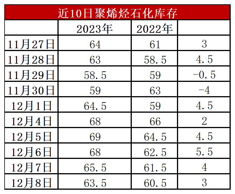 分析:周五石化库存63.5万吨,较昨天下降2万吨,较去年同期高3万吨。经历了月初垒库之后,本周石化去库恢复常态,周内去库5万吨左右。需求端目前春节包装及地膜需求尚未明显启动,需求利好有限,但是近期供应端压力缓解,尤其是PP计划外检修增多,供应减少,缓解库存压力。
