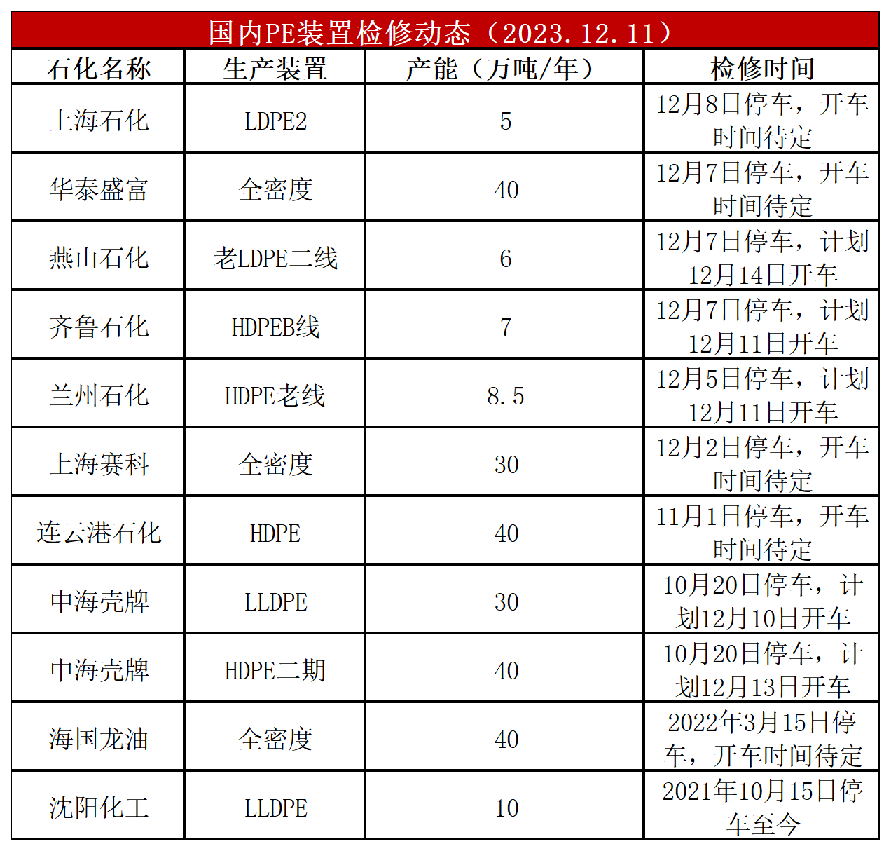 简评:PE装置中韩石化HDPE开车,上海石化LDPE、华泰盛富全密度停车,开工负荷下降至91%左右,比上周-1%,较去年同期+1%。PE装置兰州石化HDPE、齐鲁石化HDPE、燕山石化LDPE、中海壳牌计划开车,预计PE开工负荷维持高位。
