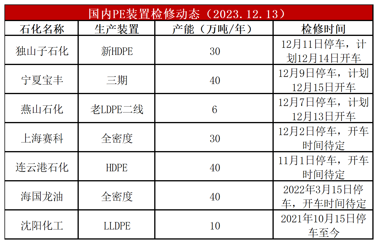 简评:PE装置兰州石化HDPE、壳牌二期LLDPE和HDPE开车,独山子HDPE和宝丰三期停车,开工负荷上涨至92%左右,比上周+1%,较去年同期+3%。PE装置兰州石化HDPE、齐鲁石化HDPE、燕山石化LDPE计划开车,预计PE开工负荷维持高位。