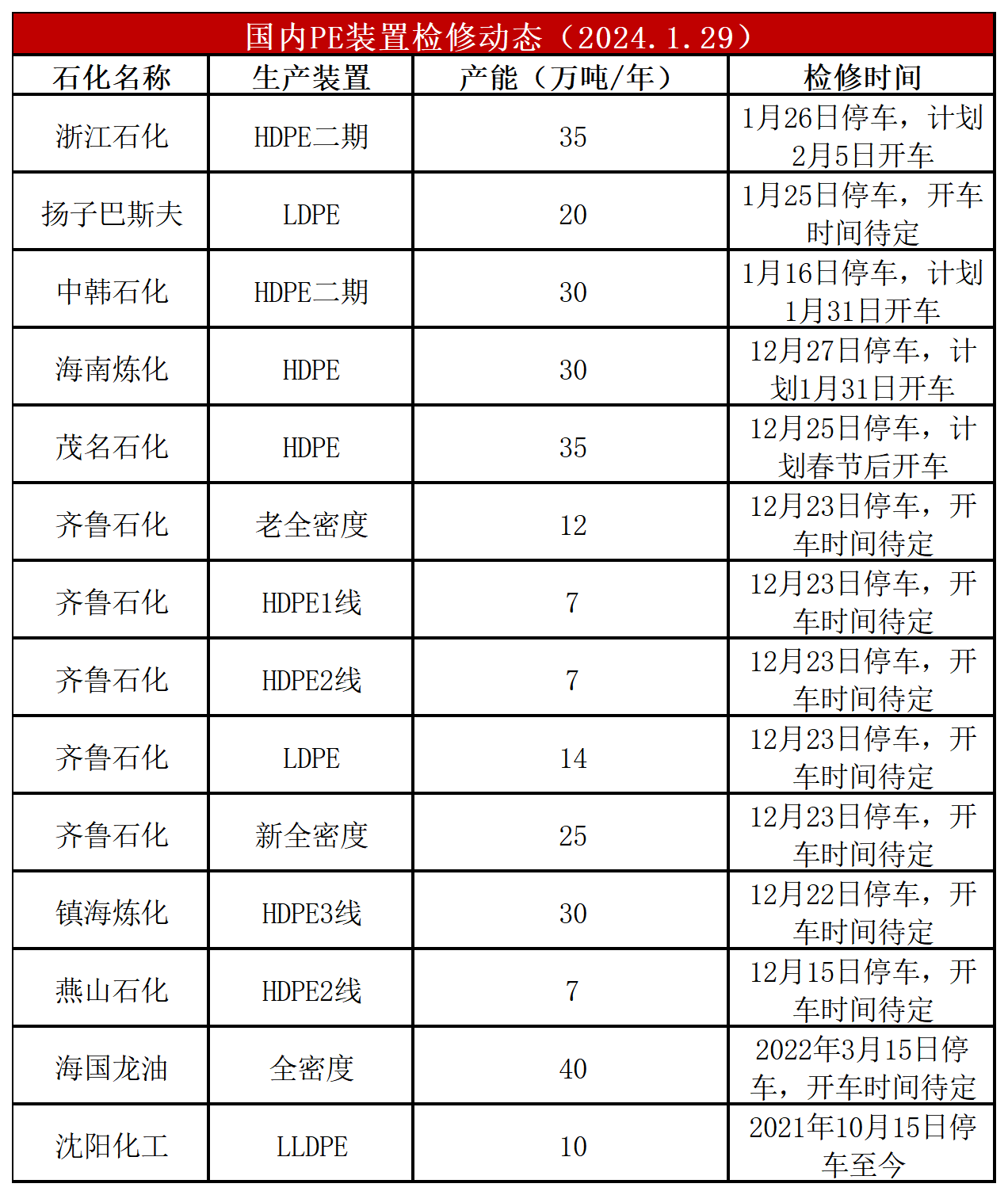 简评:PE装置浙江石化二期HDPE停车,开工复合下降至90%左右,比上周+4%,较去年同期-5%。PE装置镇海炼化HDPE、中韩石化HDPE计划开车,暂无计划停车装置,预计PE开工负荷小幅上涨。