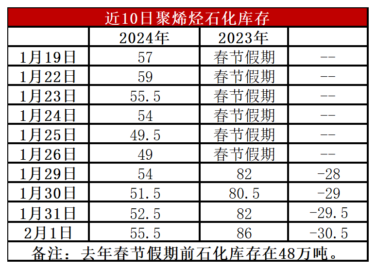 分析:周四石化库55.5存万吨,较昨天增加3万吨,较去年同期低30万吨左右(去年同期春节后大幅垒库)。下游处于备货周期,石化库存一度降至50万吨以下,不过今年下游备货力度不及预期且有提前放假迹象,并且年底临近下游基本完成备货,石化继续去库难度加大,春节下游放假但尚有正常开工,年后面临较大垒库压力。