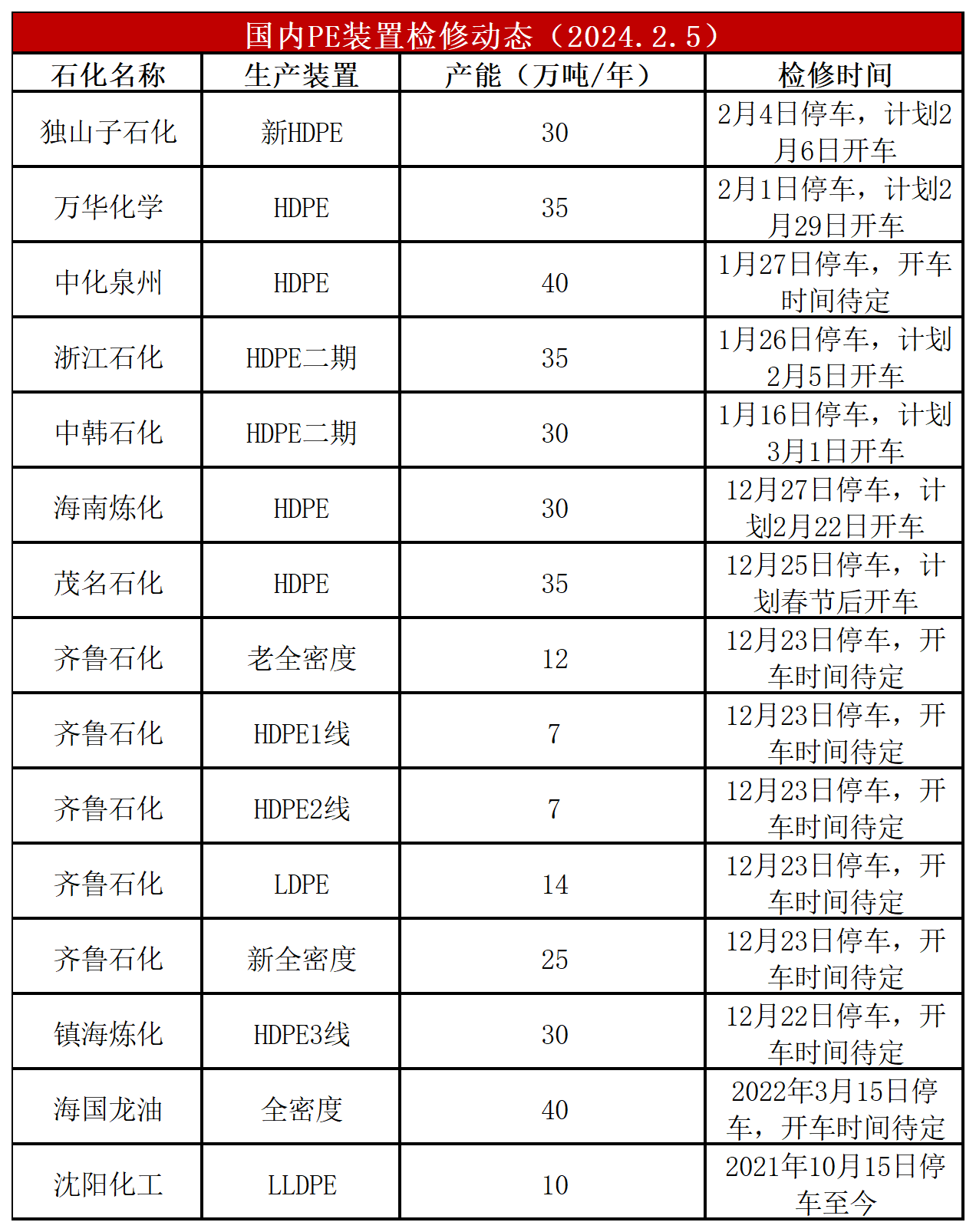 简评:PE装置大庆石化LLDPE、燕山石化HDPE、镇海炼化全密度开车,独山子石化HDPE停车,开工负荷维持88%左右,比上周-3%,较去年同期-5%。PE装置浙江石化HDPE、独山子石化HDPE计划开车,暂无计划停车装置,预计PE开工负荷小幅上涨。