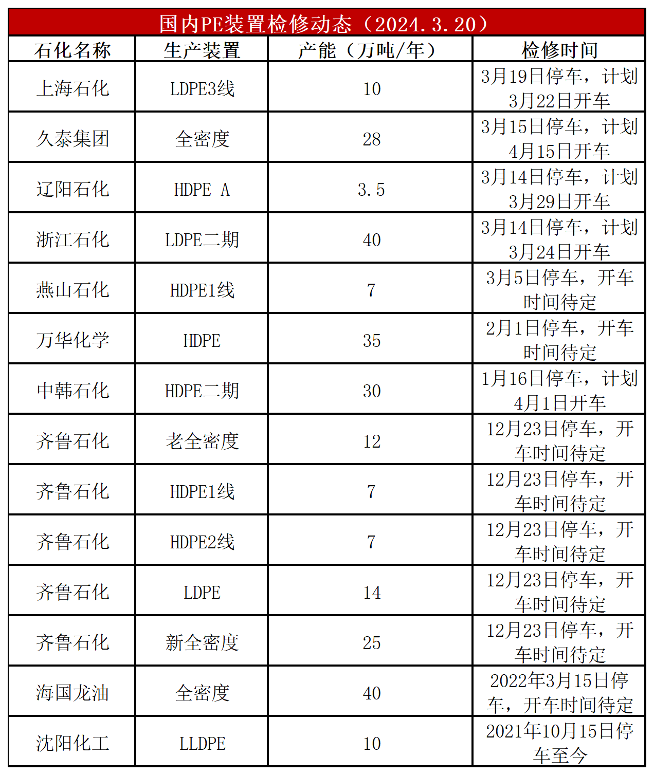 简评:PE装置上海石化LDPE停车,开工负荷维持91%左右,比上周+0%,较去年同期+0%。PE装置广东石化HDPE、连云港石化HDPE、中科炼化HDPE、海南炼化HDPE计划停车,PE开工负荷预计下跌。