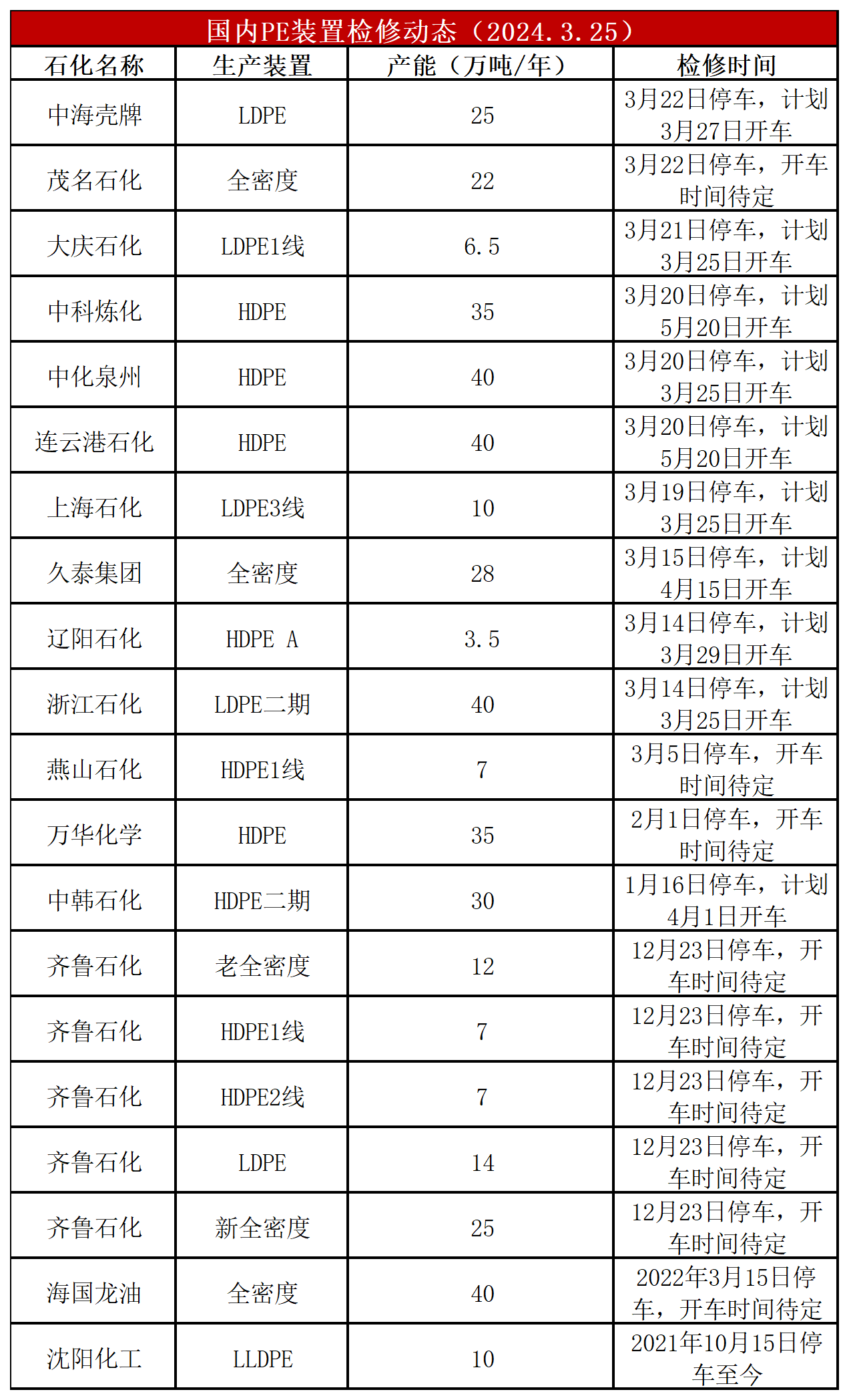 简评:PE装置独山子HDPE开车,茂名石化全密度、壳牌LDPE停车,开工负荷下跌至85%左右,比上周-6%,较去年同期-5%。PE装置浙江石化HDPE、海南炼化HDPE计划停车,上海石化LDPE、中化泉州HDPE计划开车,PE开工负荷预计小幅调整。
