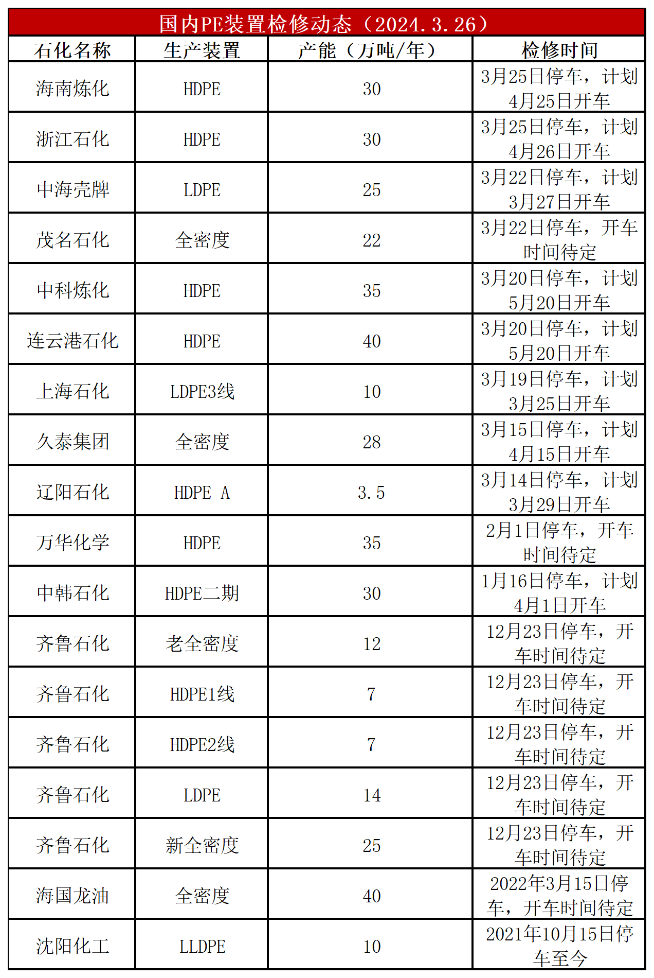简评:PE装置大庆石化LDPE、燕山石化HDPE、上海石化LDPE、浙石化LDPE、中化泉州HDPE开车,浙石化二期HDPE、海南炼化HDPE停车,开工负荷上涨至87%左右,比上周-4%,较去年同期-1%。PE暂无计划变动开车,PE开工负荷预计维持。