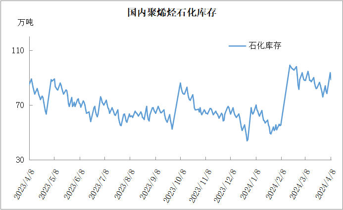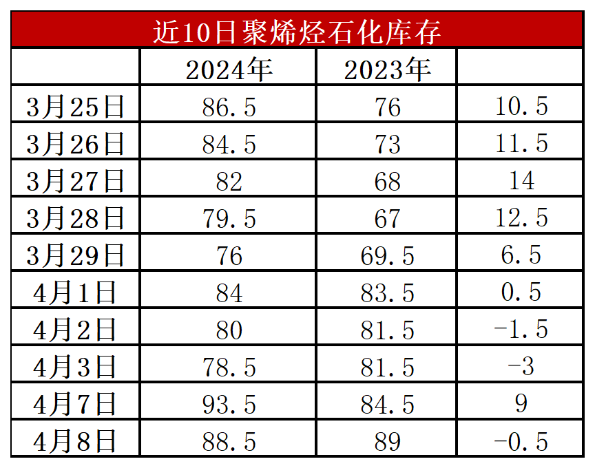 分析:周一石化库存88.5万吨,较昨天下降5.5万吨,基本与去年同期持平。清明节石化垒库15万吨,超预期,不过节后石化快速去库。目前虽然是传统需求淡季,但是聚烯烃检修力度加大,尤其是PP开工率降至80%以下,供应压力明显缓解,成为石化去库主要驱动力。