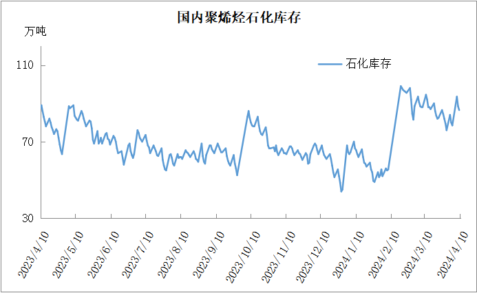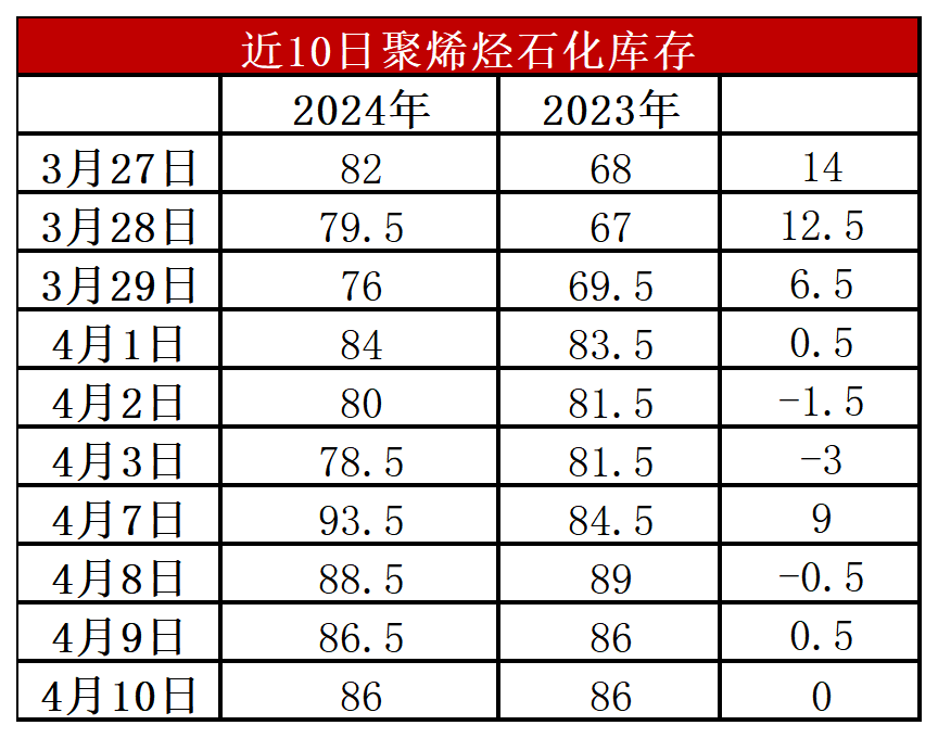 分析:周一石化库存88.5万吨,较昨天下降5.5万吨,基本与去年同期持平。清明节石化垒库15万吨,超预期,不过节后石化快速去库。目前虽然是传统需求淡季,但是聚烯烃检修力度加大,尤其是PP开工率降至80%以下,供应压力明显缓解,成为石化去库主要驱动力。