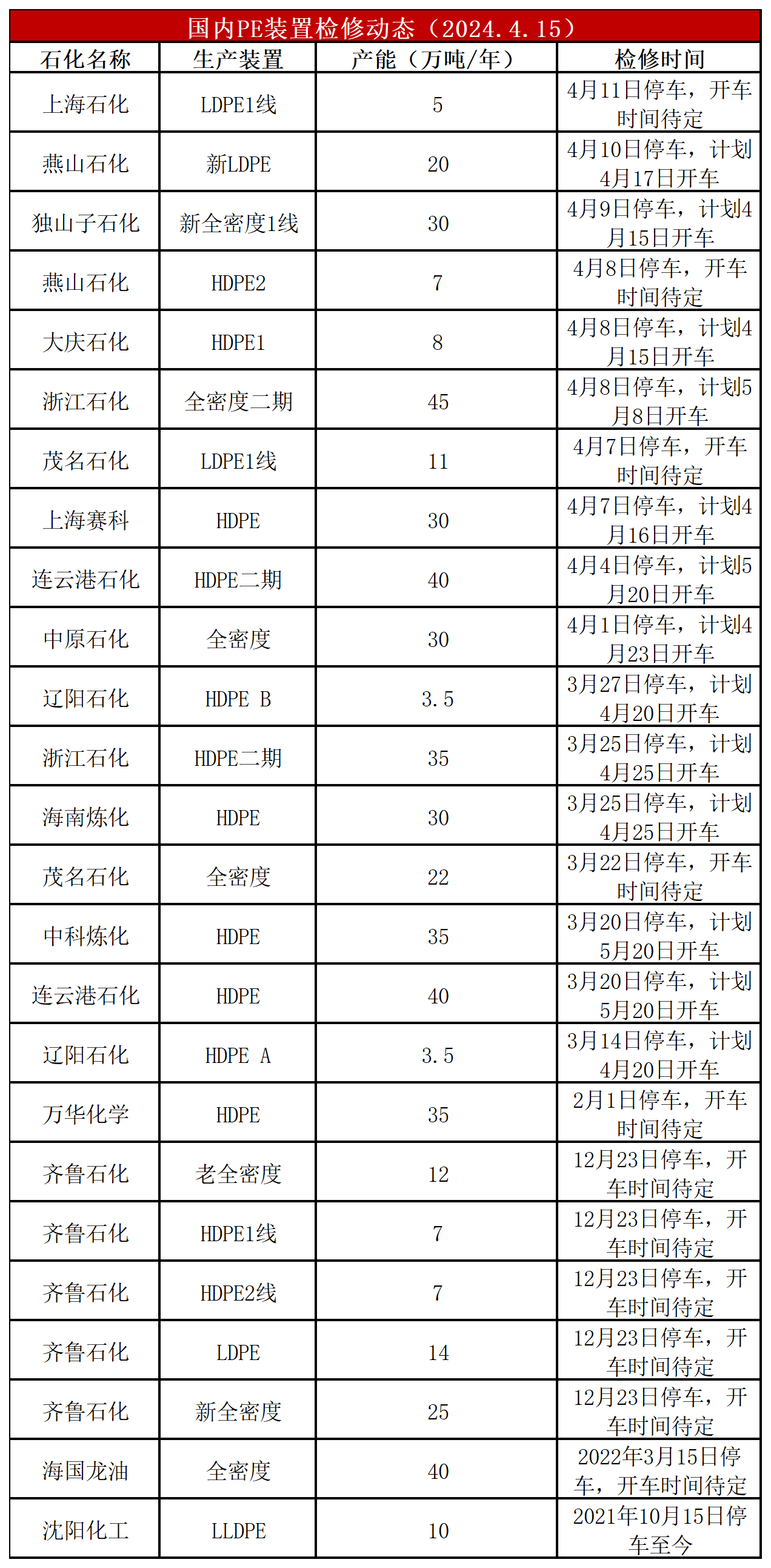 简评:PE装置浙江石化LDPE、中化泉州HDPE开车,开工负荷上涨到83%左右,比上周-4%,较去年同期-8%。PE装置上海赛科HDPE、大庆石化HDPE、燕山石化LDPE、茂名石化LDPE计划开车,广东石化HDPE、神华包头全密度计划停车,PE开工负荷低位整理。