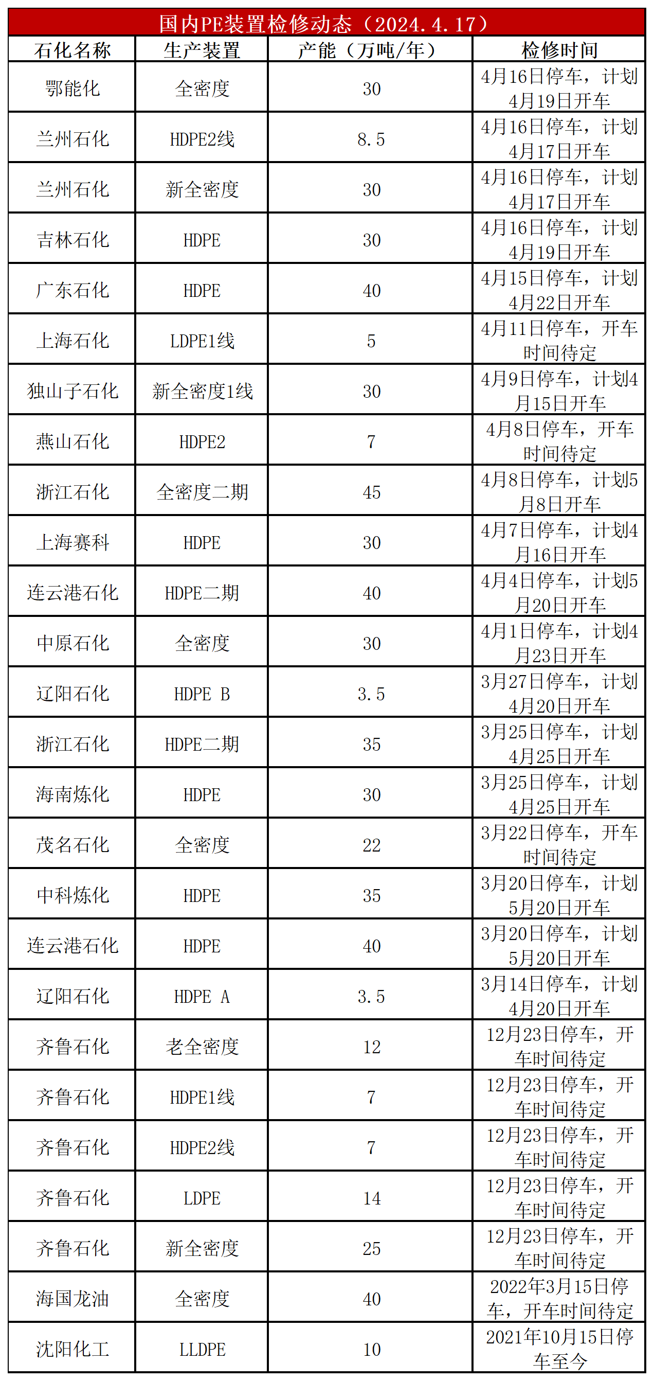 简评:PE装置独山子石化HDPE、万华化学HDPE、上海赛科HDPE开车,吉林石化HDPE、兰州石化全密度和HDPE、鄂能化停车,开工负荷维持83%左右,比上周+5%,较去年同期-7%。PE装置上海赛科HDPE、兰州石化HDPE和全密度计划开车,神华包头全密度计划停车,PE开工负荷低位整理。