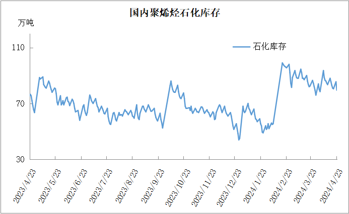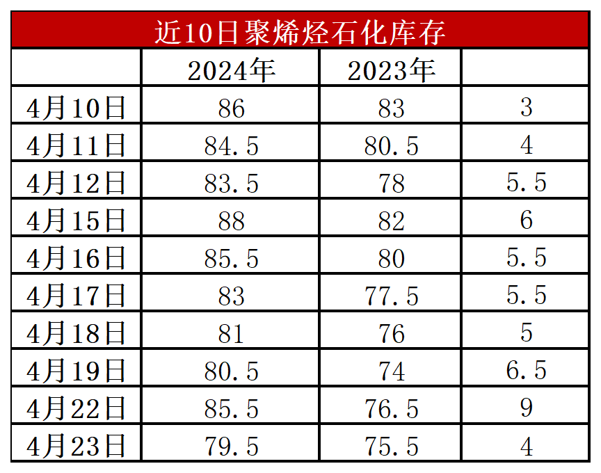 分析:周二石化库存79.5万吨,较昨天下降6万吨,较去年同期高4万吨。目前石化正常去库,虽然目前石化检修依然较多,但需求一如既往偏弱,石化库存暂无压力,五一前下游或有小范围补库,预计节前维持去库状态,但是节后库存压力较大(预计今年节后库存90万吨附近)。