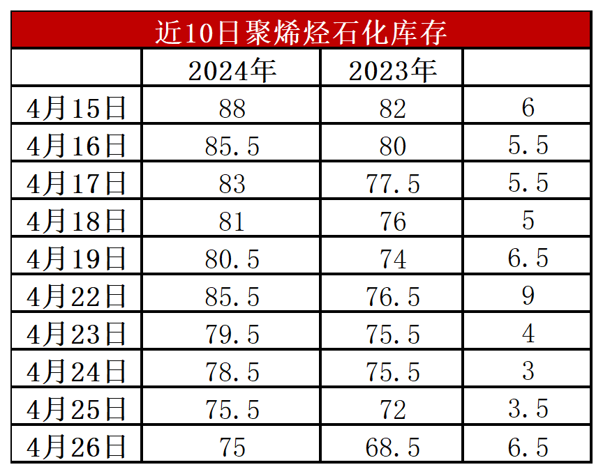 分析:周五石化库存75万吨,较昨天下降0.5万吨,较去年同期高6.5万吨。石化去库减慢,但是临近月底,石化库存暂无压力,五一前下游或有小范围补库,石化检修较多支撑去库,预计节前维持去库状态,但是节后库存压力较大(预计今年节后库存90万吨附近)。