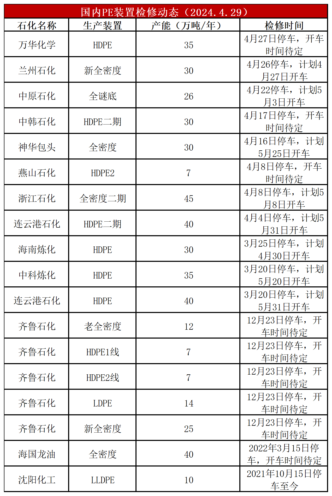 简评:PE装置独山子老全密度、延长中煤全密度、塔里木两条线开车,万华HDPE停车,开工负荷上涨到86%左右,比上周+4%,较去年同期-6%。PE装置海南炼化HDPE、中原石化全密度和兰州石化新全密度计划开车,PE开工负荷小幅上涨。