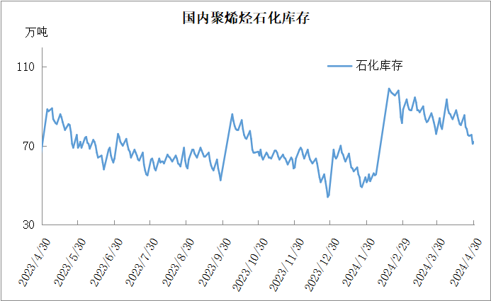 分析:周二石化库存72万吨,较昨天增加1万吨,较去年同期高8.5万吨。月底石化考核,加之节前备货,石化去库顺畅一度降至70万吨附近,但是今天停销结算,石化短暂垒库。本周将迎来五一小长假,节后石化垒库压力较大,预计节后库存将超过90万吨(去年同期垒库25万吨至88.5万吨)。