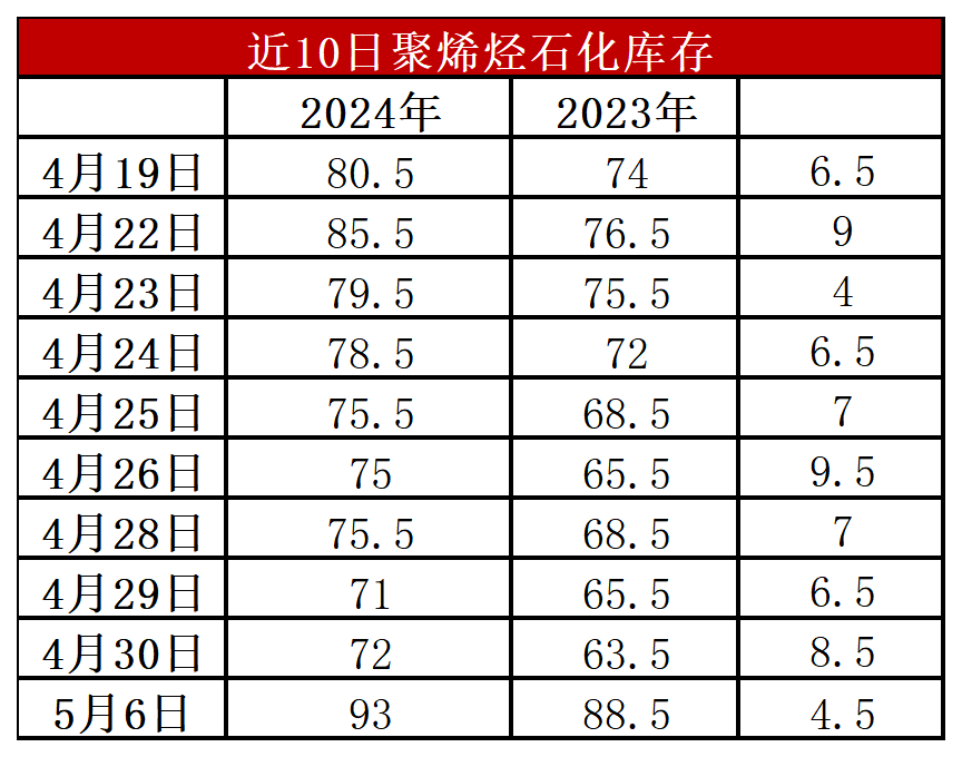分析:五一小长假过后石化库存93万吨,较节前增加21万吨,较去年同期高5万吨左右。五一长假垒库基本在预期之内,节后虽然短期有补库空间,石化去库压力可暂时缓解,但是五月份检修力度减弱,部分新装置面临投产,需求进入传统淡季,石化库存短期难以降至节前70万吨附近水平。