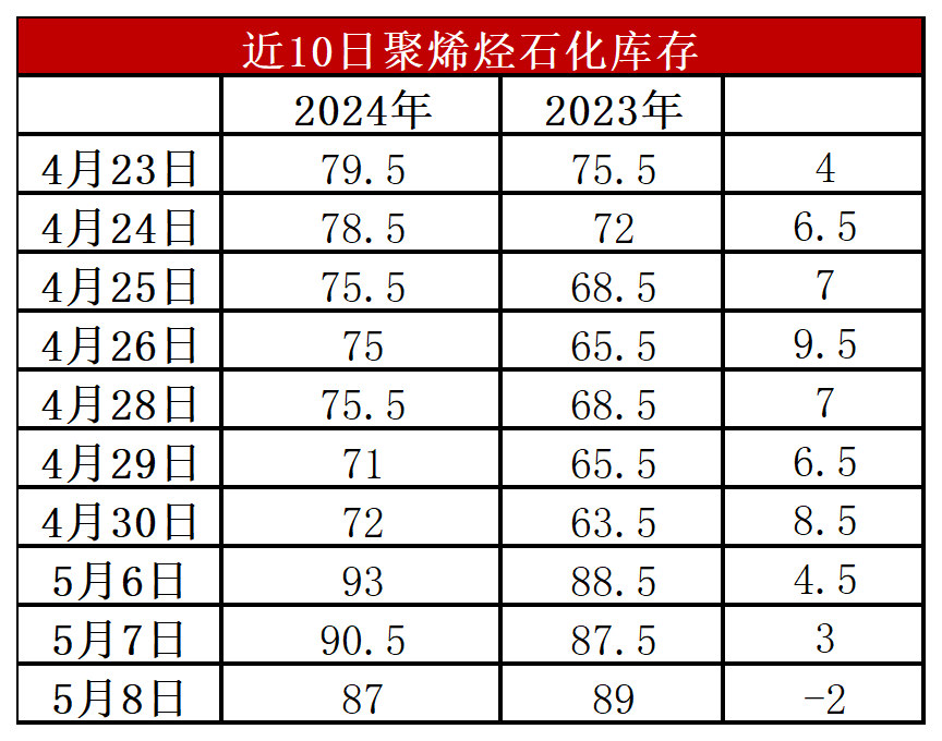 分析:周三石化库存87万吨,较昨天下降3.5万吨,较去年同期低2万吨。五一长假垒库基本在预期之内,节后虽然短期有补库空间,石化去库压力可暂时缓解,但是五月份检修力度减弱,部分新装置面临投产,需求进入传统淡季,石化库存短期难以降至节前70万吨附近水平。