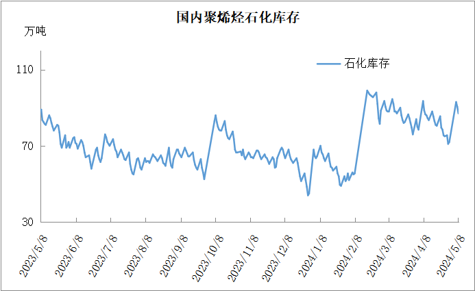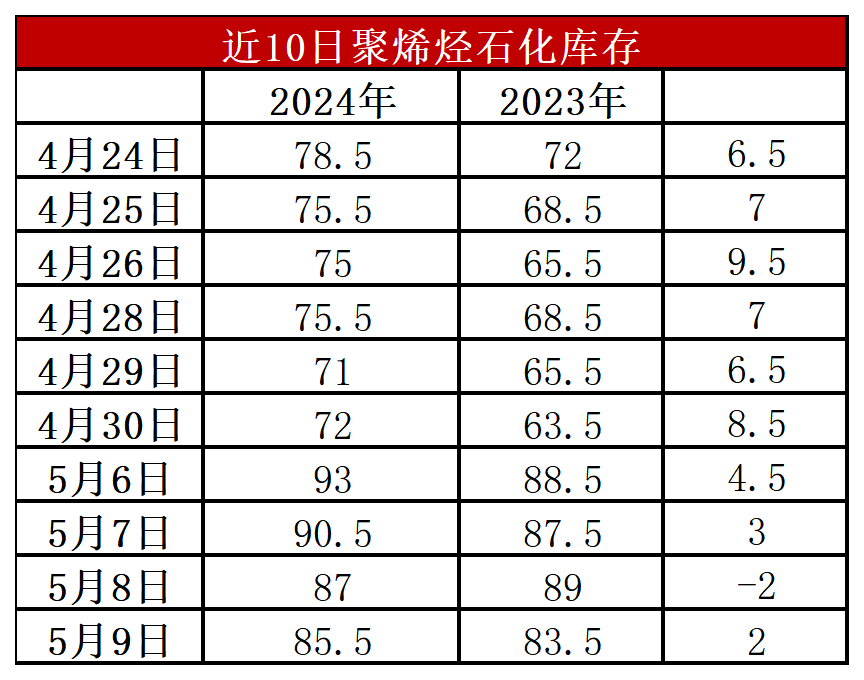 分析:周四石化库存85.5万吨,较昨天下降1.5万吨,较去年同期高2万吨。五一长假垒库基本在预期之内,节后虽然短期有补库空间,石化去库压力可暂时缓解,但是五月份检修力度减弱,部分新装置面临投产,需求进入传统淡季,石化库存短期难以降至节前70万吨附近水平。
