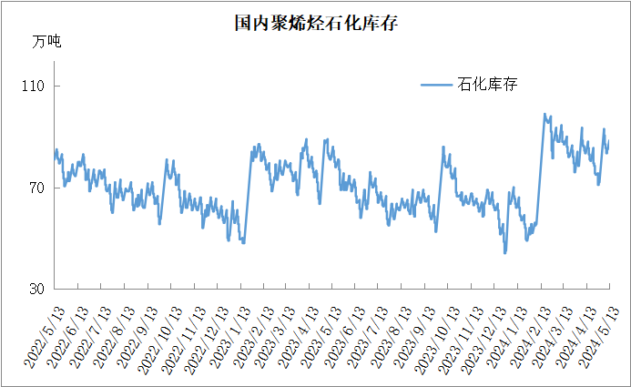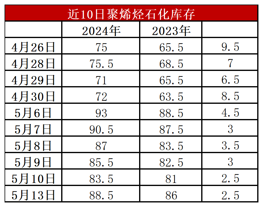 分析:周一石化库存88.5万吨,较昨天增加3.5万吨,较去年同期高2.5万吨。五一之后短暂垒库之后,石化恢复正常去库,目前虽然检修力度较大,开工率大幅下降,供应压力缓解,但是需求端进入淡季,成交不畅,二者抵消后石化去库维持正常水平,但是暂时难以到达前期70万吨附近低点水平。