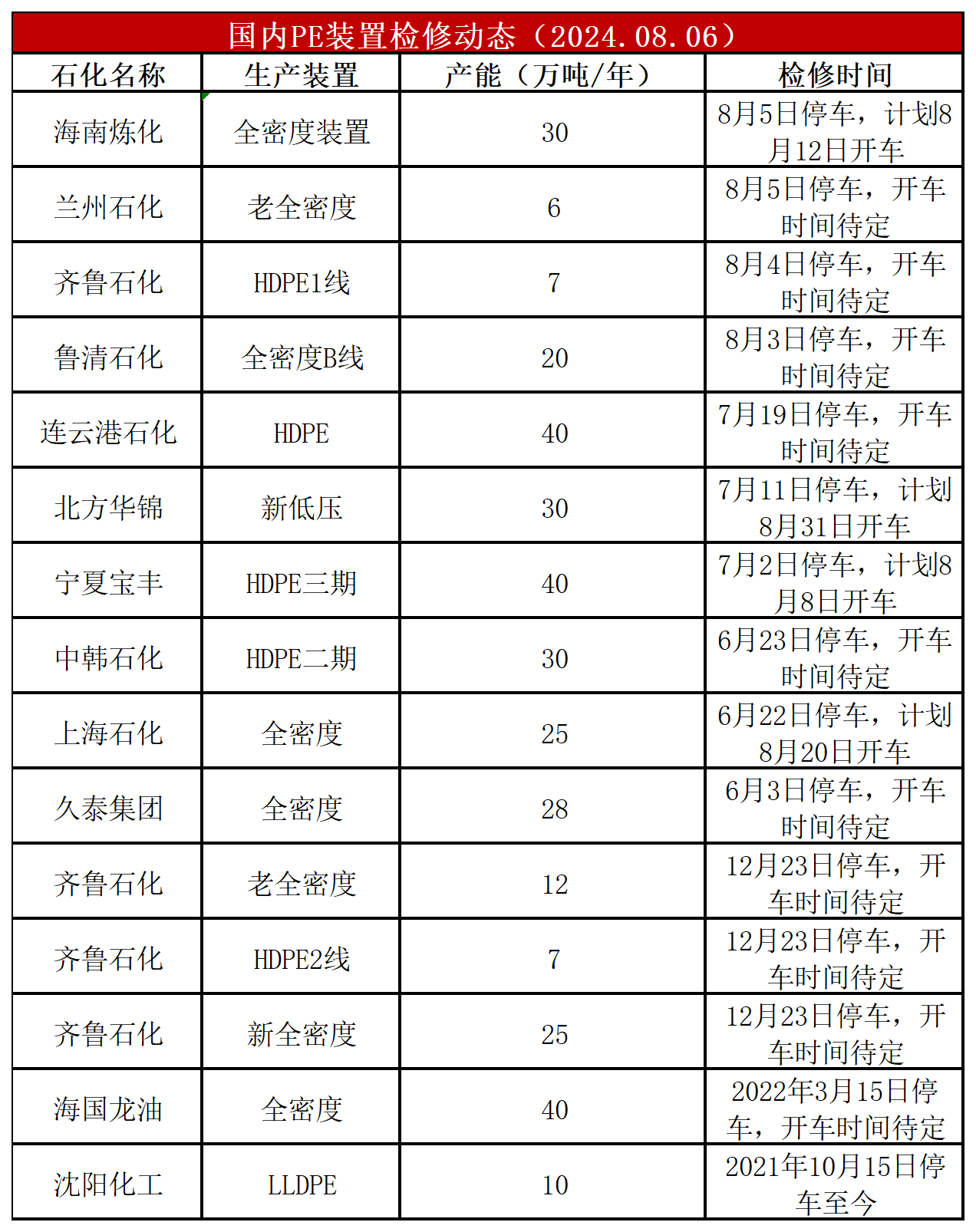 简评:PE装置中天合创全密度、燕山石化老LDPE1线、劲海化工HDPE、广东石化全密度2线开车,兰州石化老全密度、齐鲁石化HDPEA线、鲁清石化全密度B线、海南炼化全密度停车,开工负荷上涨至88%左右,比上周+3%,较去年同期+2%。PE 装置宁夏宝丰HDPE三期、上海石化LDPE计划开车,浙江石化LDPE二期计划停车,PE开工负荷预计小幅调整。