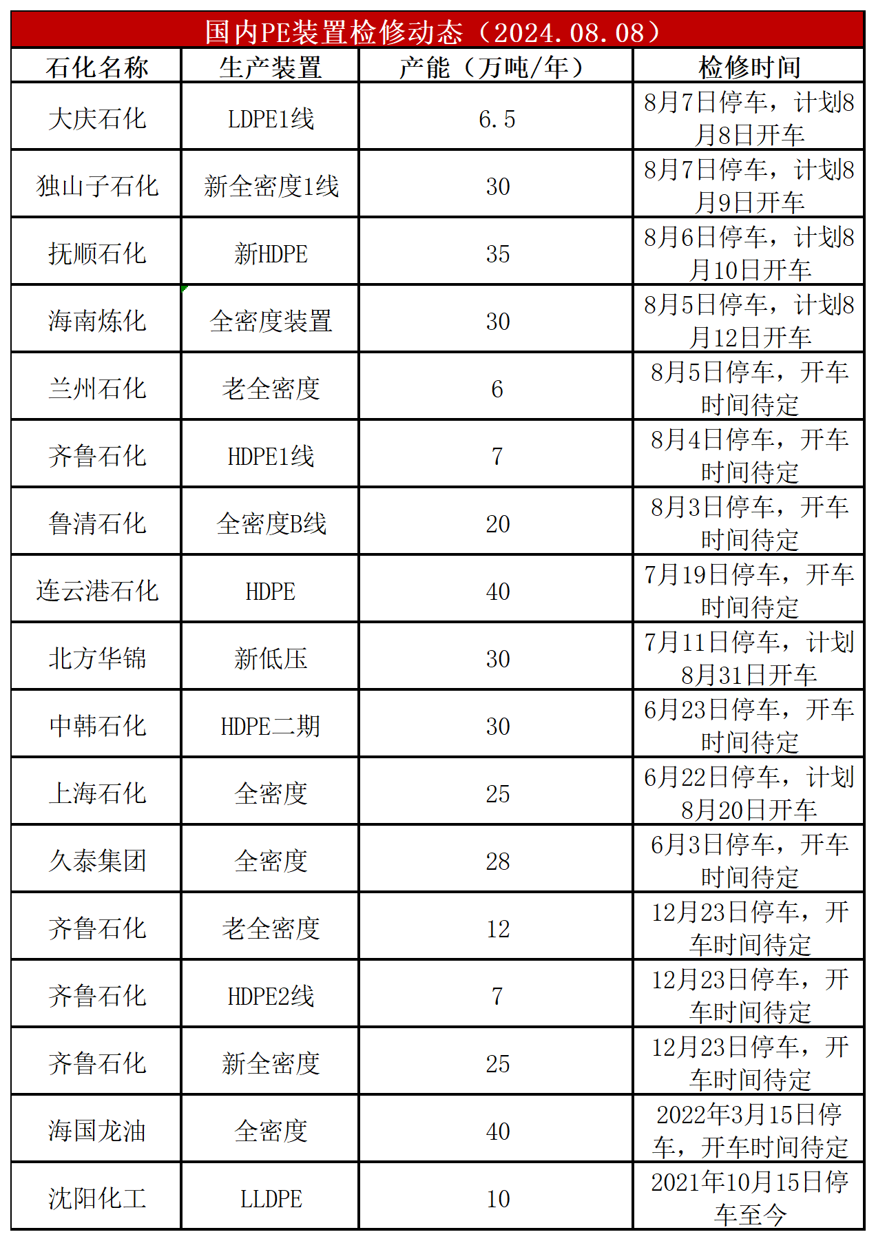 简评:PE装置宁夏宝丰HDPE三期、新疆天利LDPE开车,大庆石化LDPE一线、独山子石化新全密度1线停车,开工负荷维持87%左右,比上周+1%,较去年同期-2%。PE 装置抚顺石化新HDPE、大庆石化LDPE1线、独山子石化新全密度1线计划开车,PE开工负荷预计走势偏强。